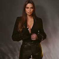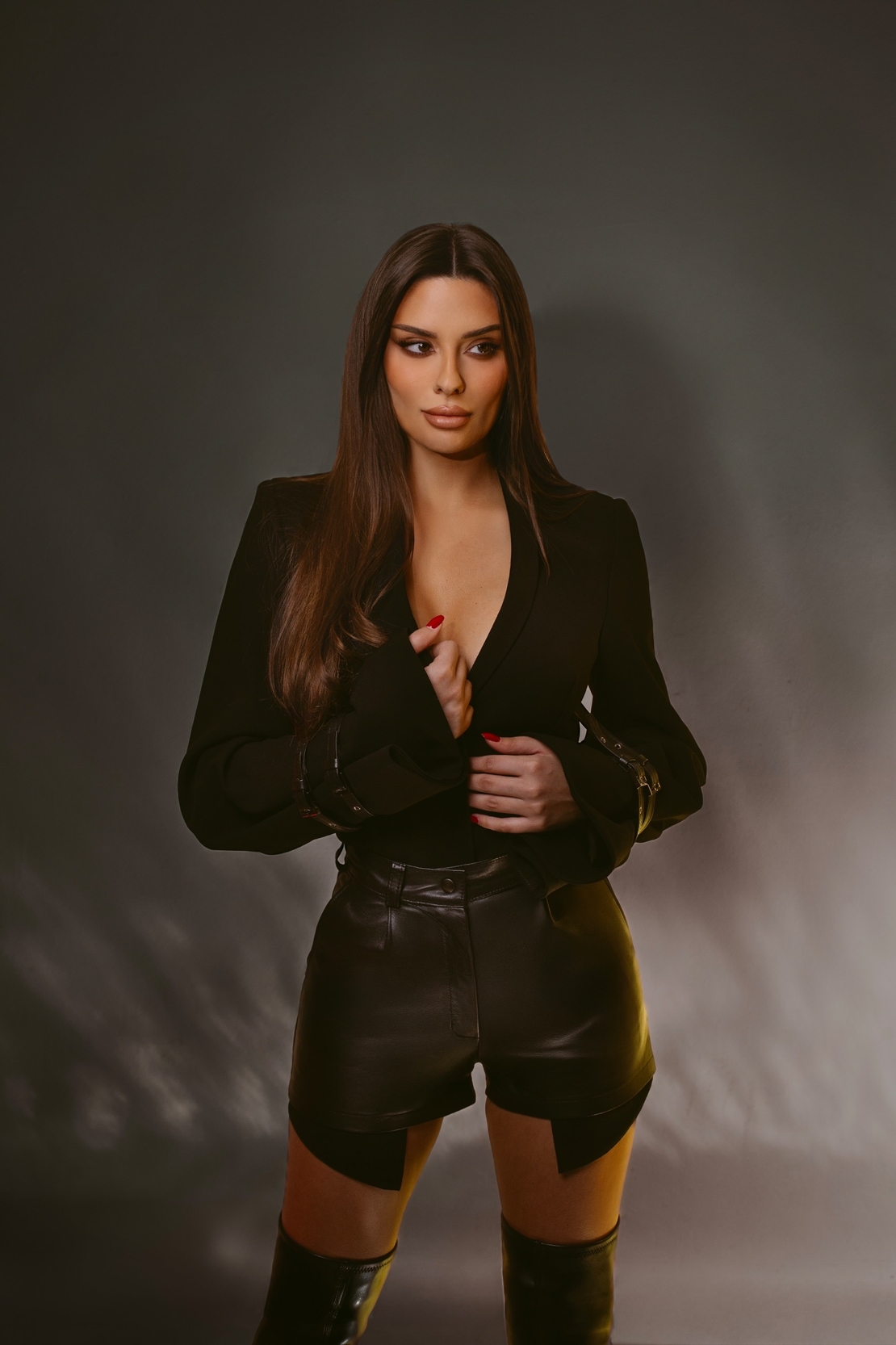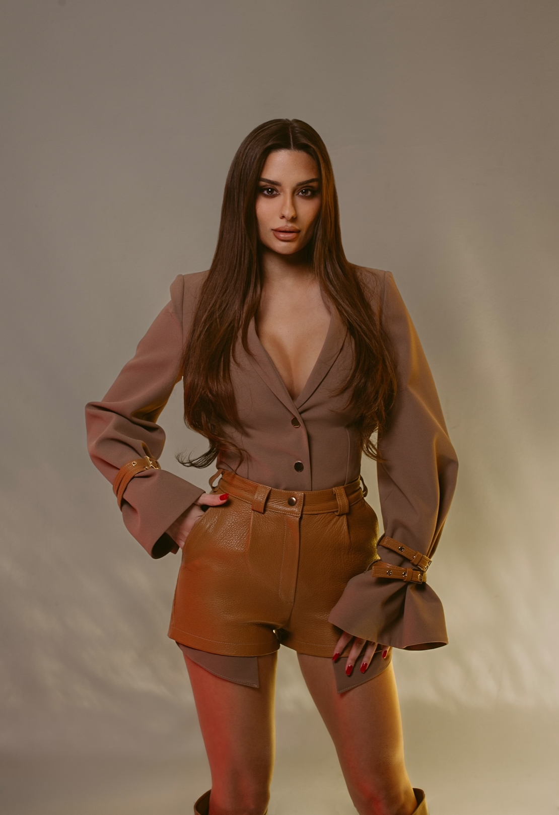 Shirt and shorts in our way. Leather X double crepe georgette.
